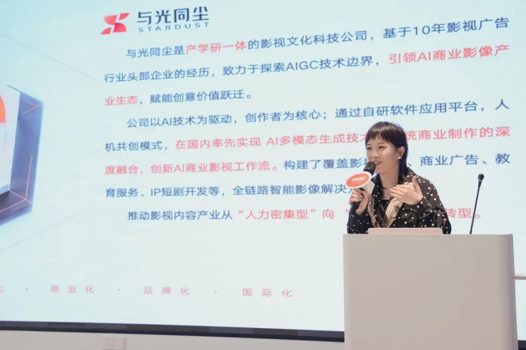 与光同尘集团合伙人兼运营总监黄媛媛结合成熟商业案例,详细介绍了与光同尘的创新实践。凭借成熟的AI商业影视工作流与全流程工具平台,与光已服务众多头部品牌,高效产出高质量商业影像内容,显著降低制作成本、提升生产效率。此外,与光还通过产教融合与实战培训,助力品牌方构建可落地的AIGC能力体系,推动内容生产的智能化与国际化。